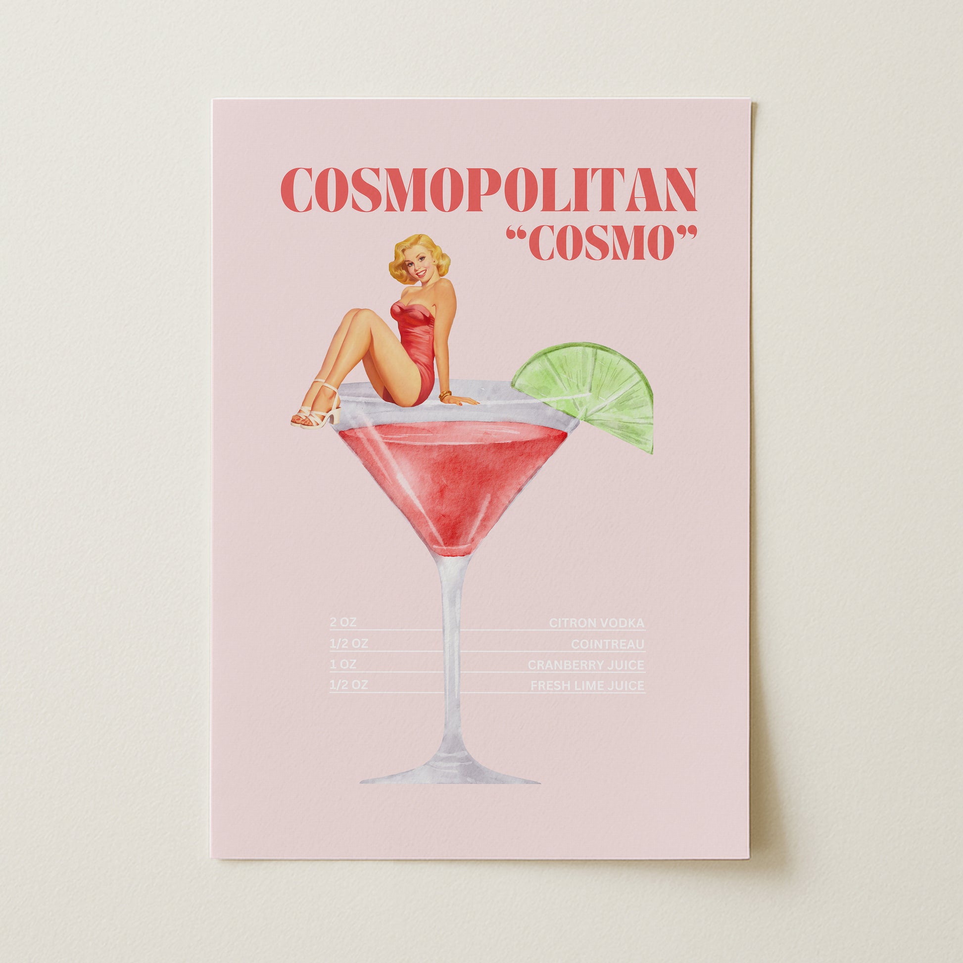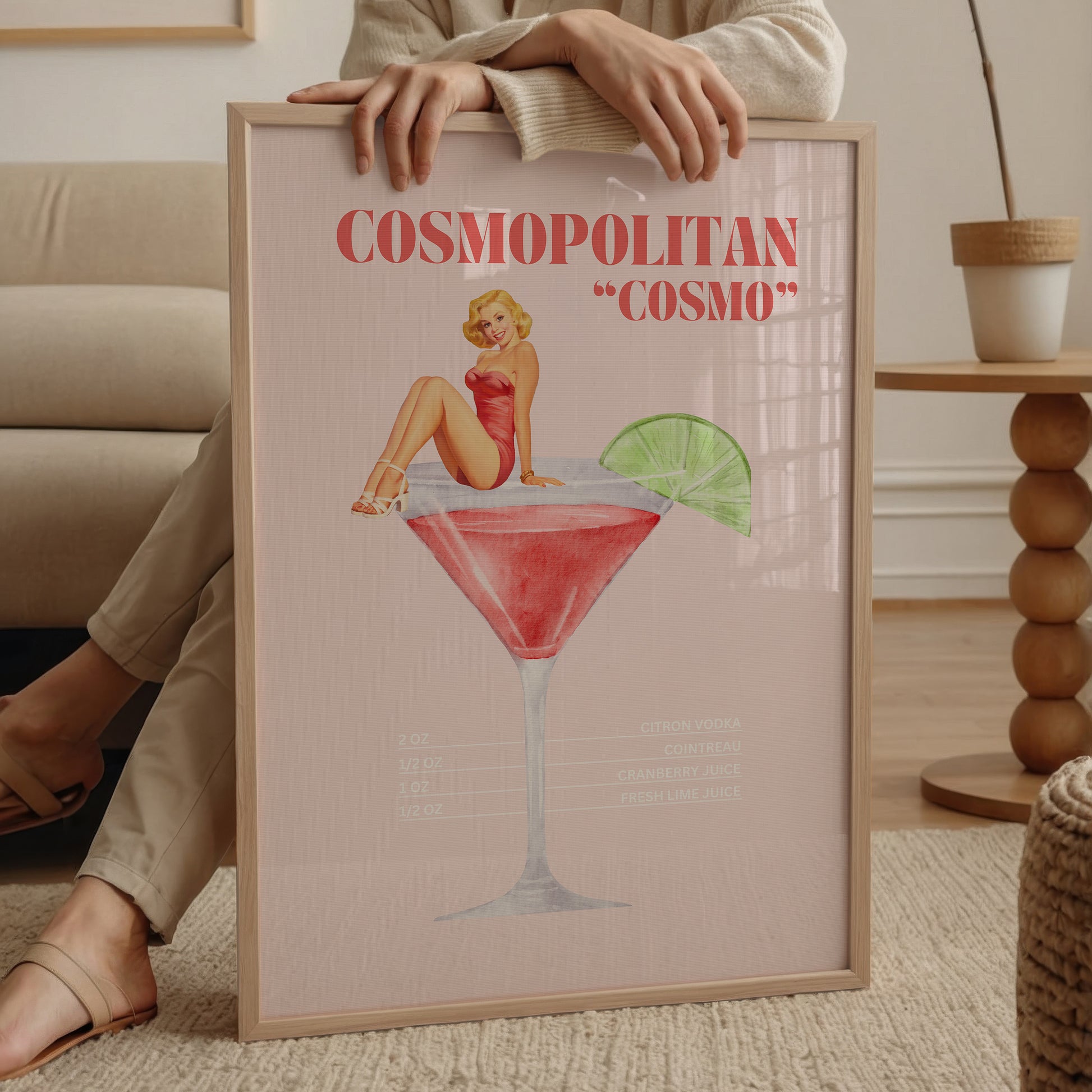Kadehin üzerinde zarif pozuyla yer alan pin-up tarzı figür, tasarıma hem eğlenceli hem de nostaljik bir dokunuş katarken, Cosmo tarifinin poster üzerinde yer alması bu eseri hem dekoratif hem de işlevsel bir hale getiriyor. Kokteyl severler, tasarım tutkunları ve evde kendi içkisini hazırlamaktan hoşlanan herkes için mükemmel bir hediye seçeneği.