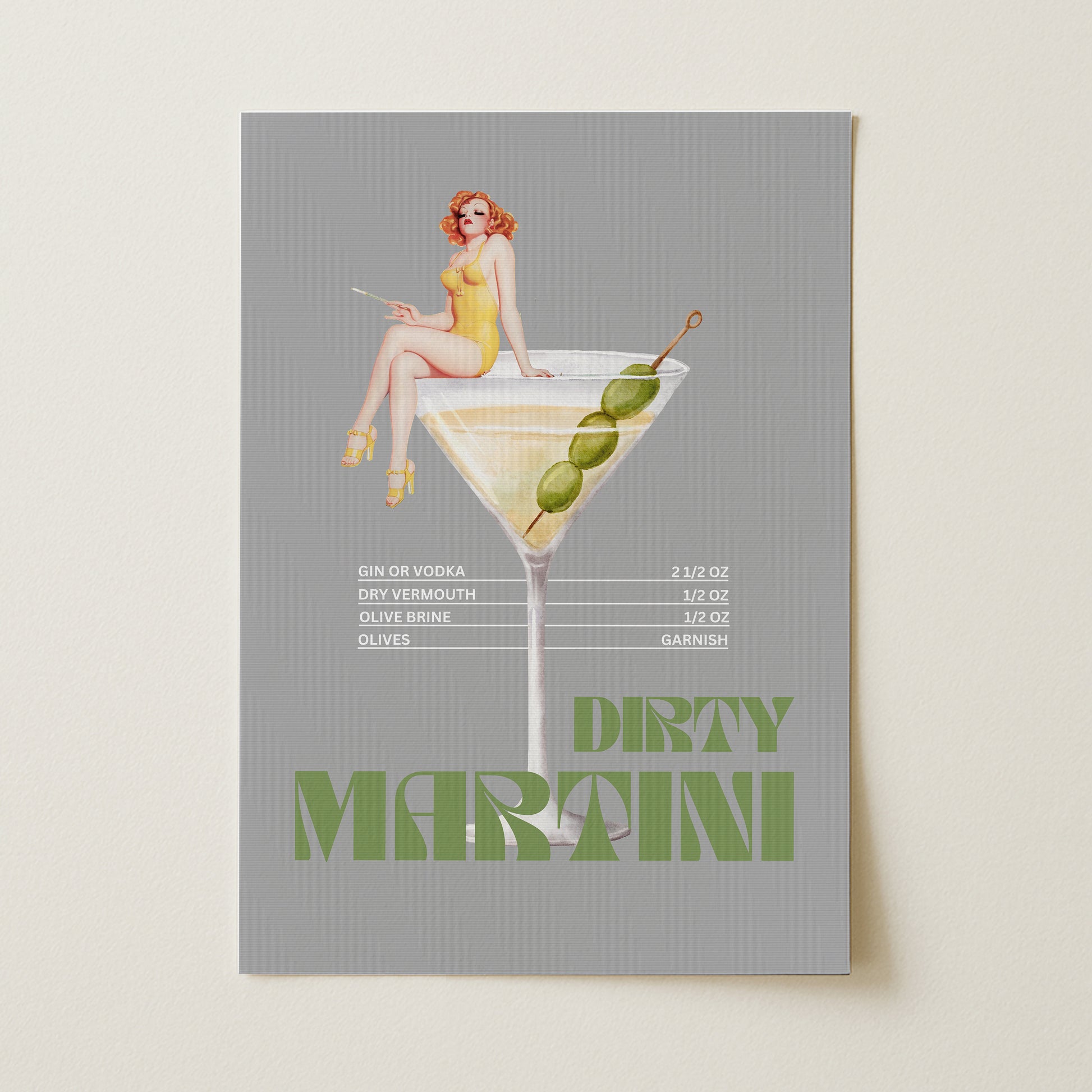 Dirty Martini Poster, vintage illüstrasyonu ve modern minimal arka planı bir araya getirerek hem sanat hem de kokteyl kültürünü sevenlere hitap eden özel bir dekorasyon ürünü sunar.