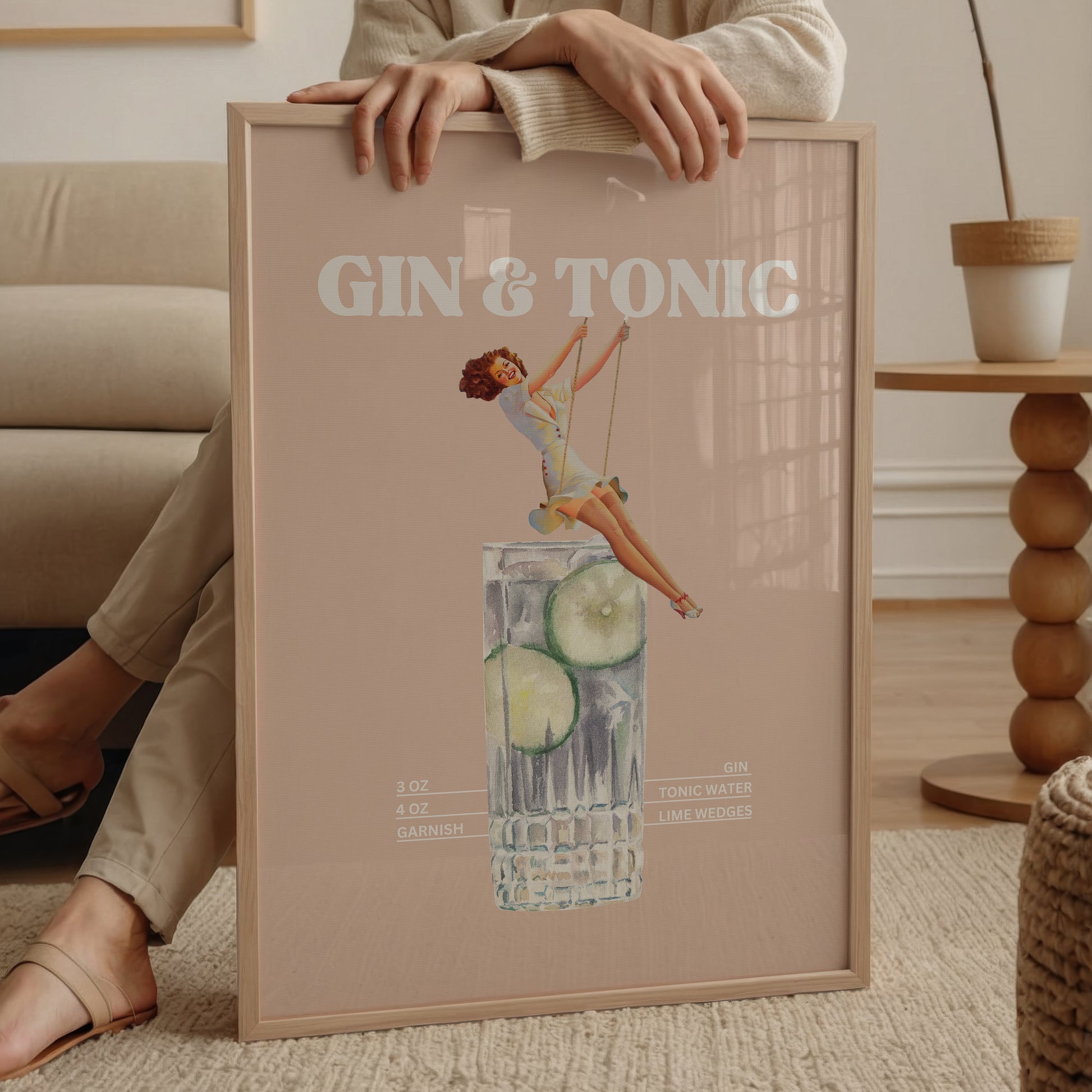 Gin & Tonic Poster, vintage illüstrasyonu ve modern minimal arka planı bir araya getirerek hem sanat hem de kokteyl kültürünü sevenlere hitap eden özel bir dekorasyon ürünü sunar.