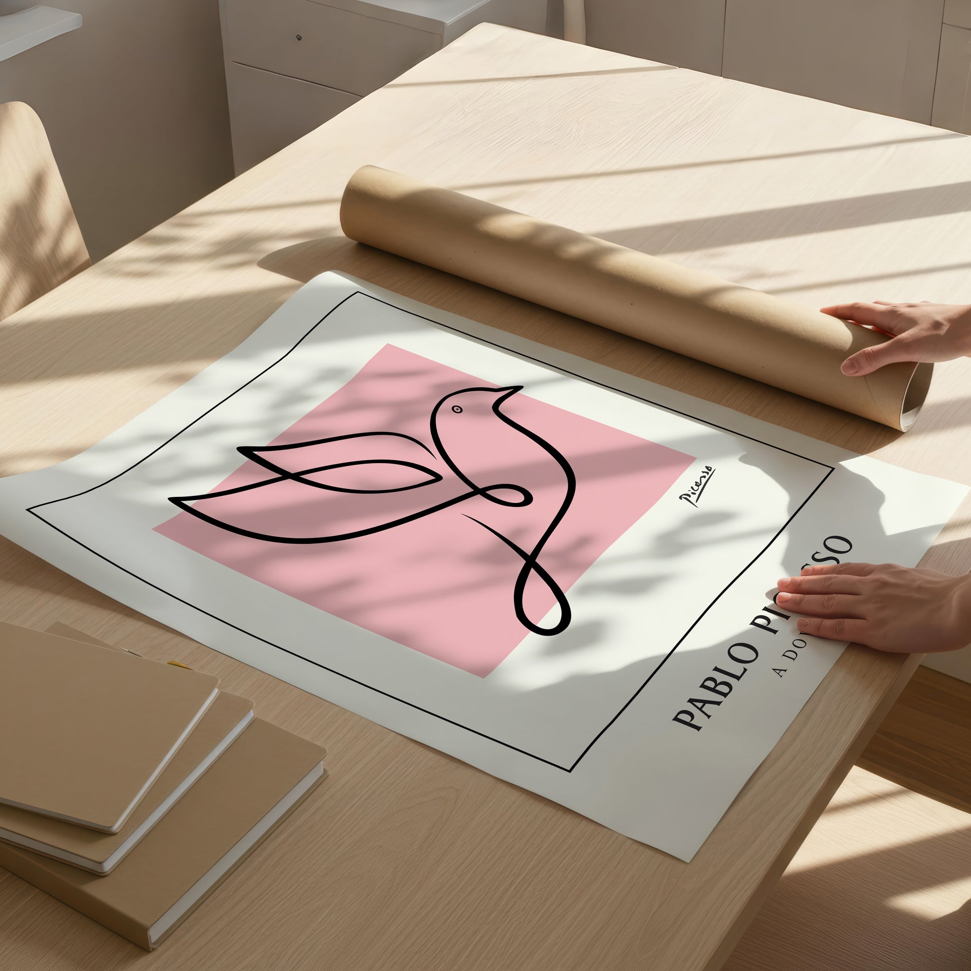 Pablo Picasso – A Dove, sanatçının barış ve özgürlük temasını yalın bir çizgiyle ifade ettiği ikonik güvercin yorumlarından ilham alır. Tek bir sürekli çizgiyle oluşturulan kuş figürü, Picasso’nun sade formlarla güçlü anlamlar yaratma ustalığını yansıtır.